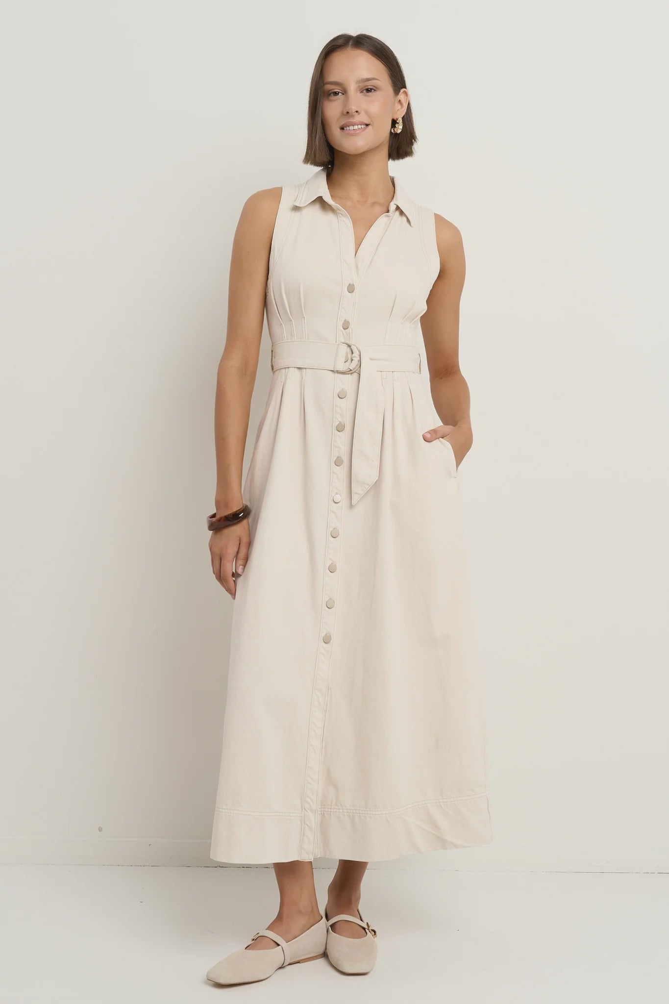 Crescent Denim Sleeveless Midi Shirt Dress / Ecru