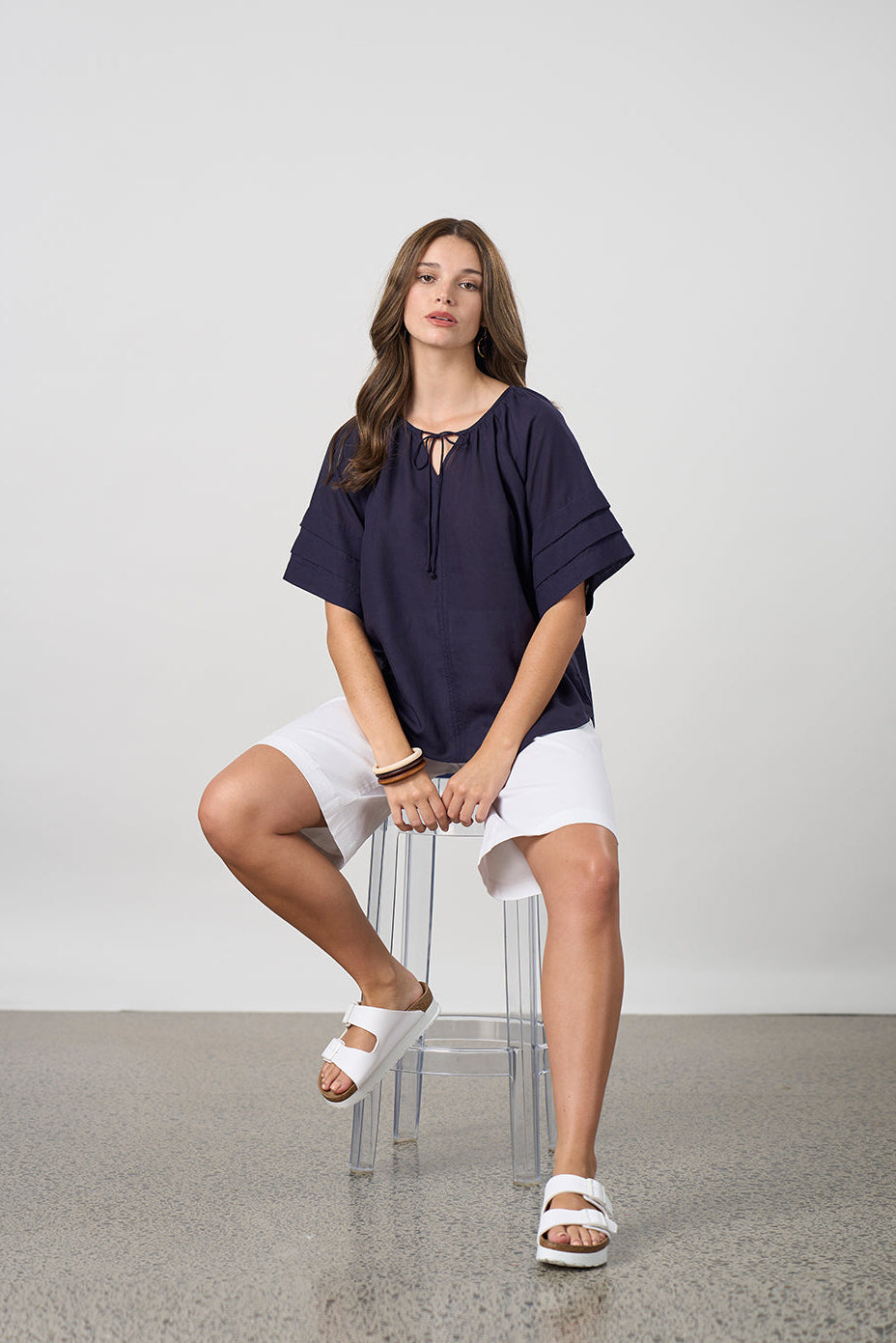 A-line short with front darts and forward front seams for an elevated style. Has functional pockets with an elasticated back waist.