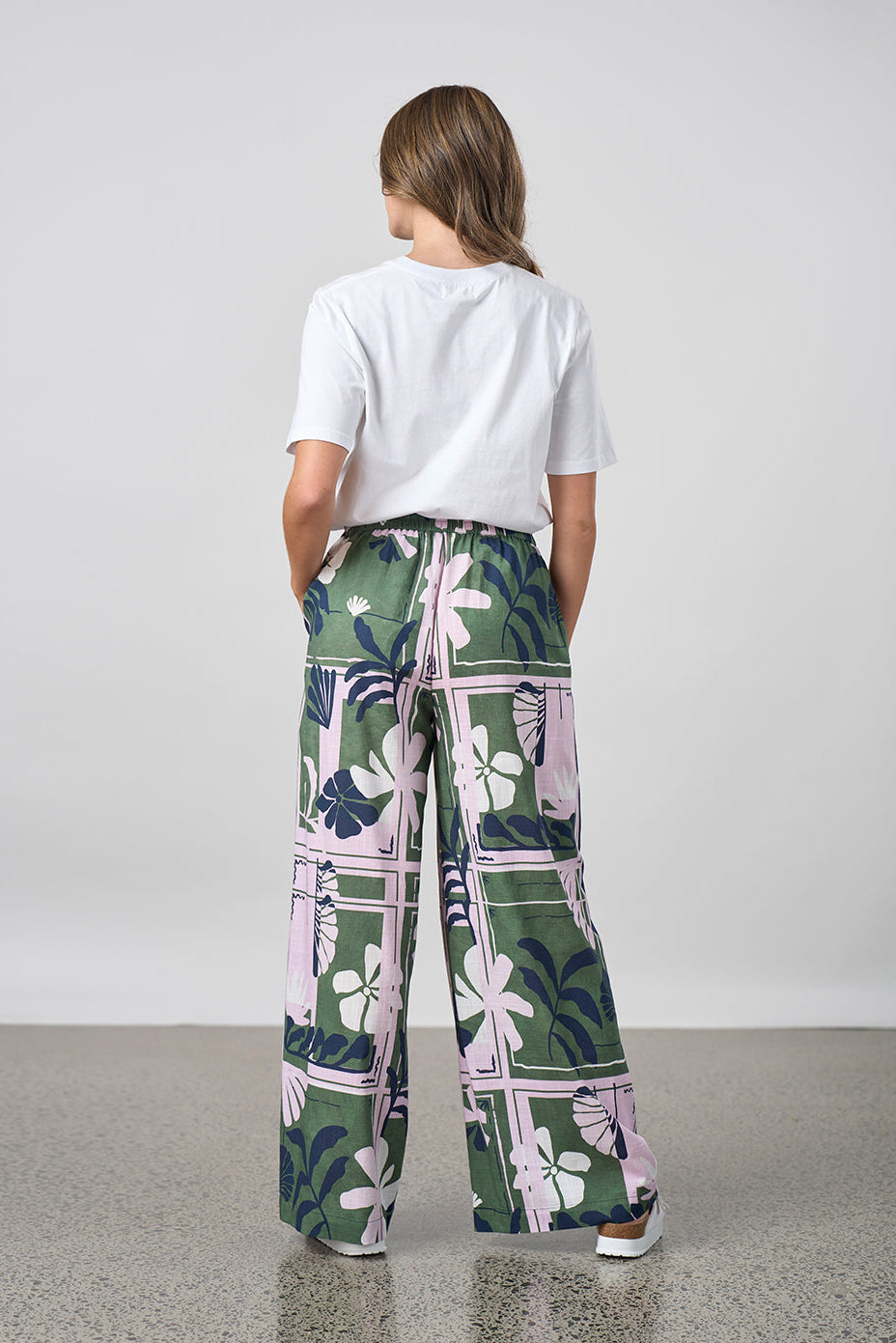 Printed, wide leg pant with a flat front and a waist tie through channel for a perfect fit. Featuring contrast side panel detailing. Functional pockets.
