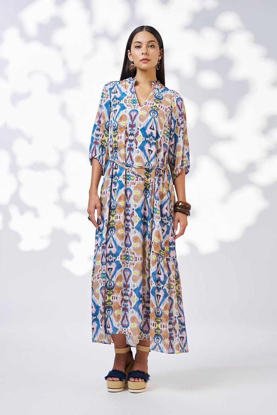 Printed A-line dress with gathered side hem panels to add volume. Wide sleeves gather into elasticated cuffs. Features matching belt and in-seam side pockets.