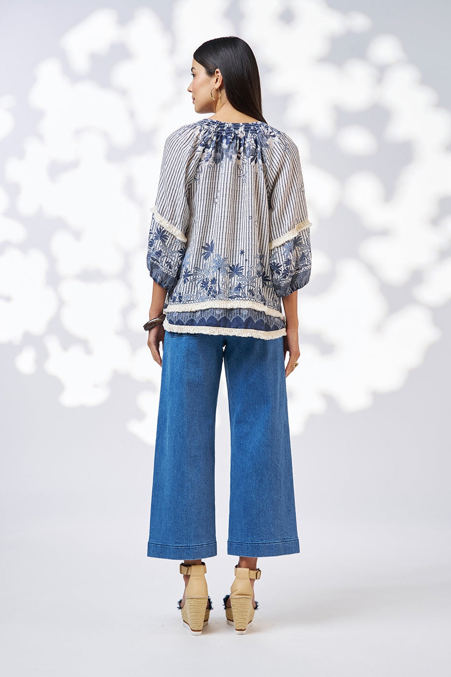 Printed blouse with a shirred neckline to create a V neck style and add flattering volume. Featuring delicate fringing trim at lower arm and hem, with elasticated cuffs.